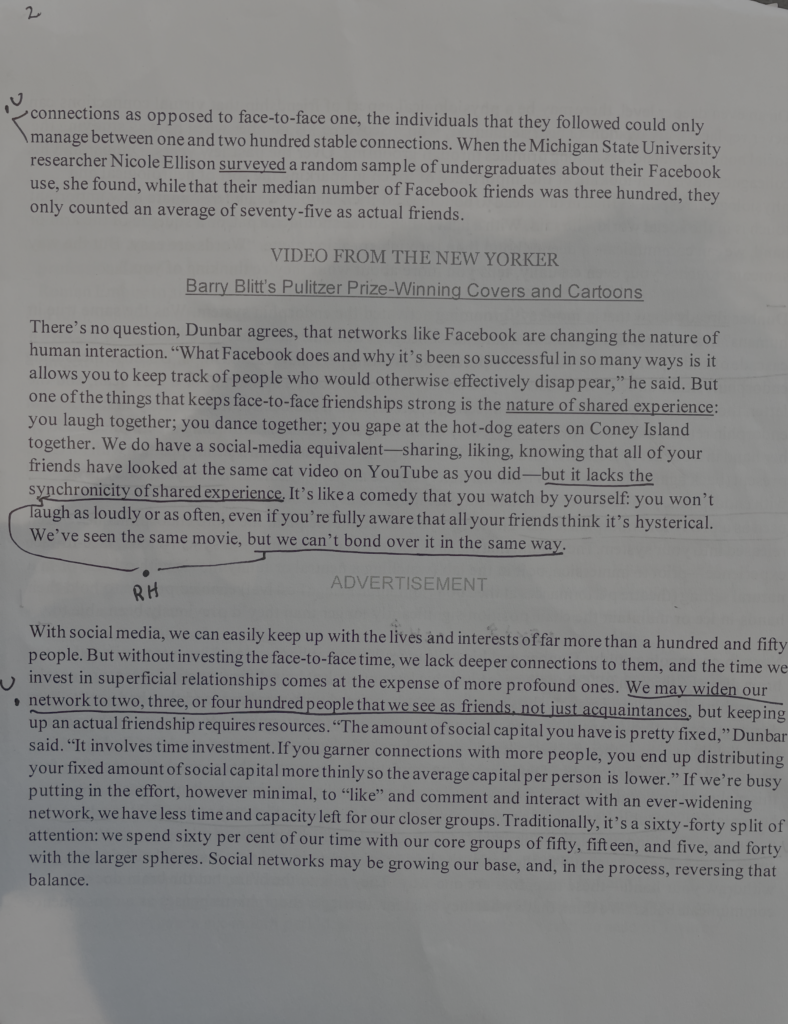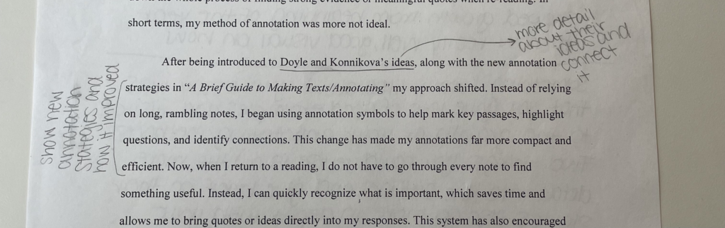 After being introduced to Doyle and Konnikova’s ideas, along with the new annotation strategies in “A Brief Guide to Making Texts/Annotating” my approach shifted. Instead of relying on long, rambling notes, I began using annotation symbols to help mark key passages, highlight questions, and identify connections. This change has made my annotations far more compact and efficient. Now, when I return to a reading, I do not have to go through every note to find something useful. Instead, I can quickly recognize what is important, which saves time and allows me to bring quotes or ideas directly into my responses.