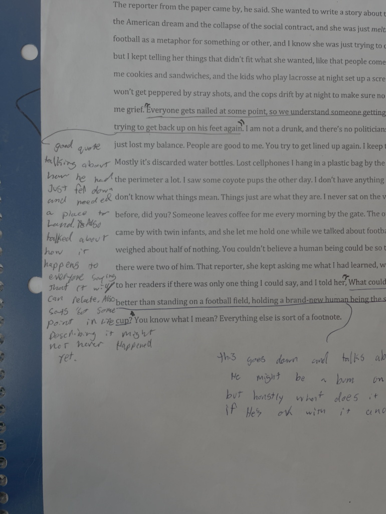 For example, when I was annotating “The Hawk,” I tended to underline large sections of text and then draw a line out to a free corner of the page where I would scribble a quick sentence about what I thought was important. At first, this was fine, but when I attempted to reread the text later and it was unclear and took too long. The notes were scattered, and I often struggled to remember what I had originally meant. The lack of organization confused and slowed down the whole process of finding strong evidence or meaningful quotes when re-reading. In short terms, my method of annotation was not ideal.