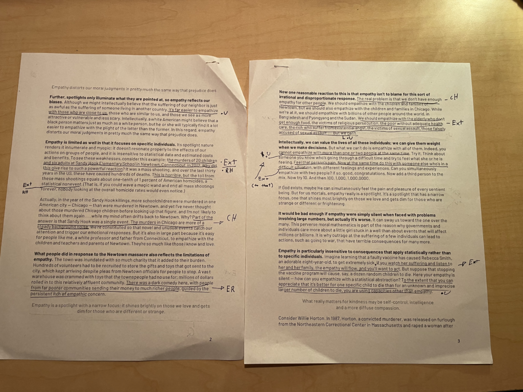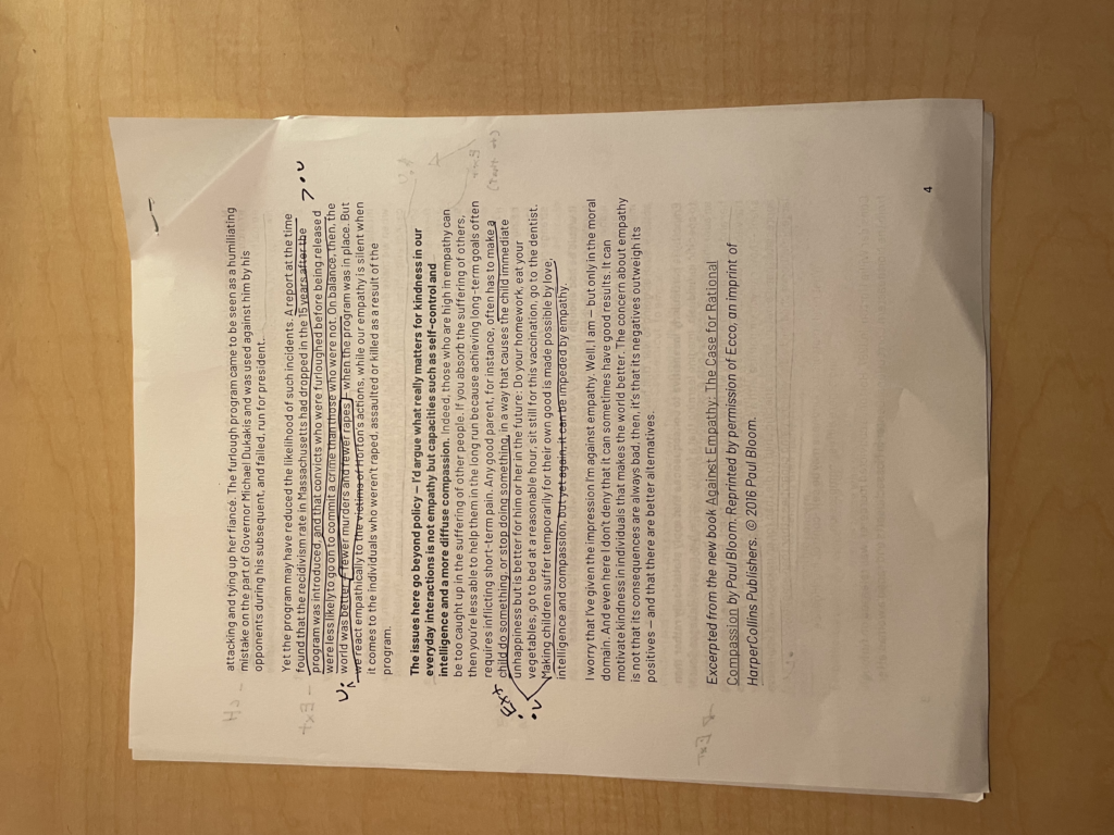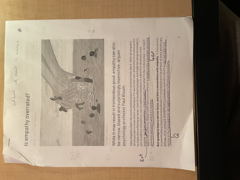 A strong claim from Bloom that sparked a strong response, “Empathy is a spotlight that shines on some people and leaves others in darkness.” This highlights how empathy can be unfair and partial. From my perspective, empathy can indeed be selective, it also serves as a tool for kindness. I think learning how to expand our empathy beyond just those Infront of us would be key.